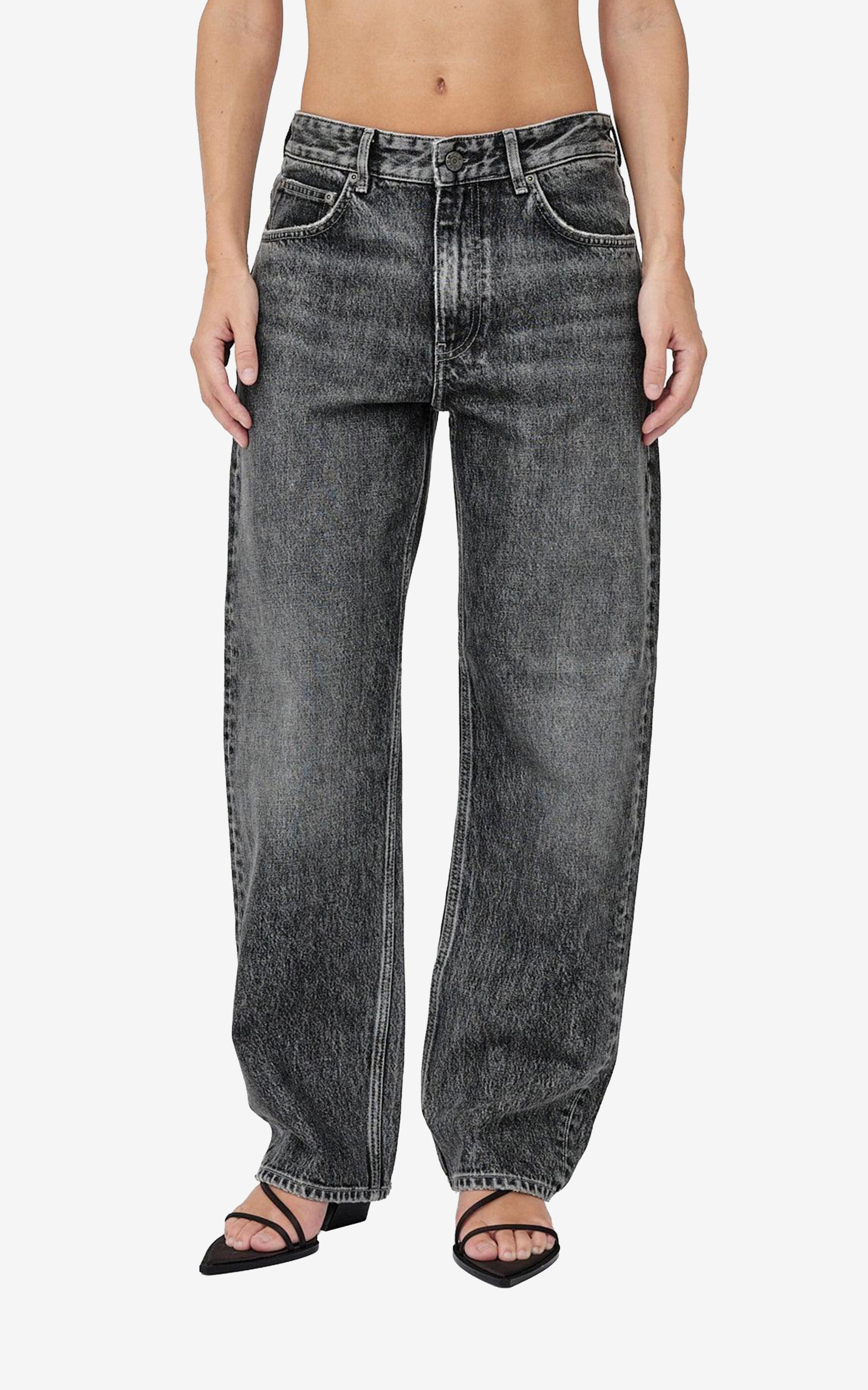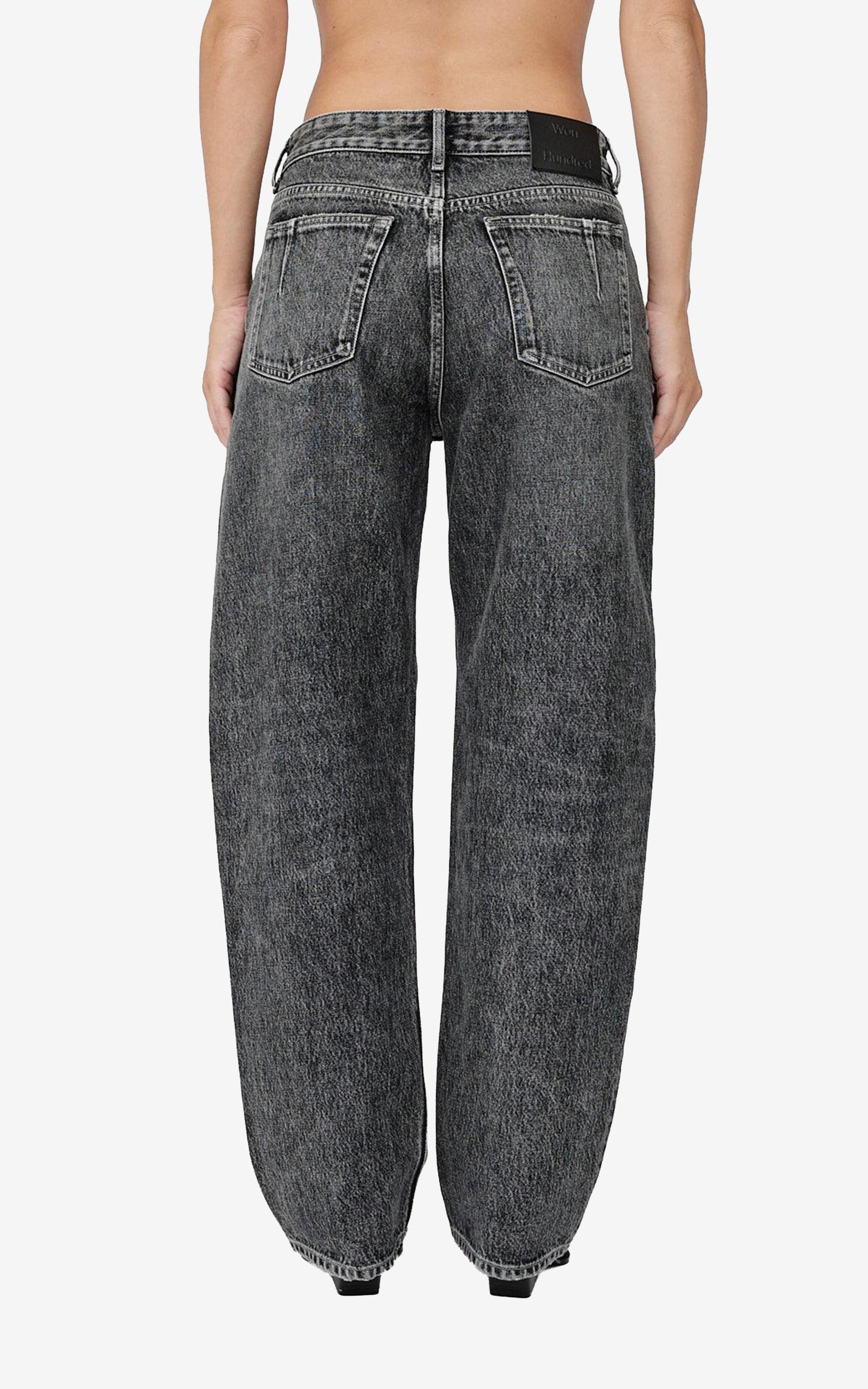 The Alexandra Tinted Black jeans are designed with a straight fit and a slightly balloon-shaped silhouette, featuring a mid-waist and a straight leg in a regular length. Crafted in rigid denim, the style is finished with branded logo buttons, a leather logo label, and Won Hundred’s signature dart detail at the back pockets.